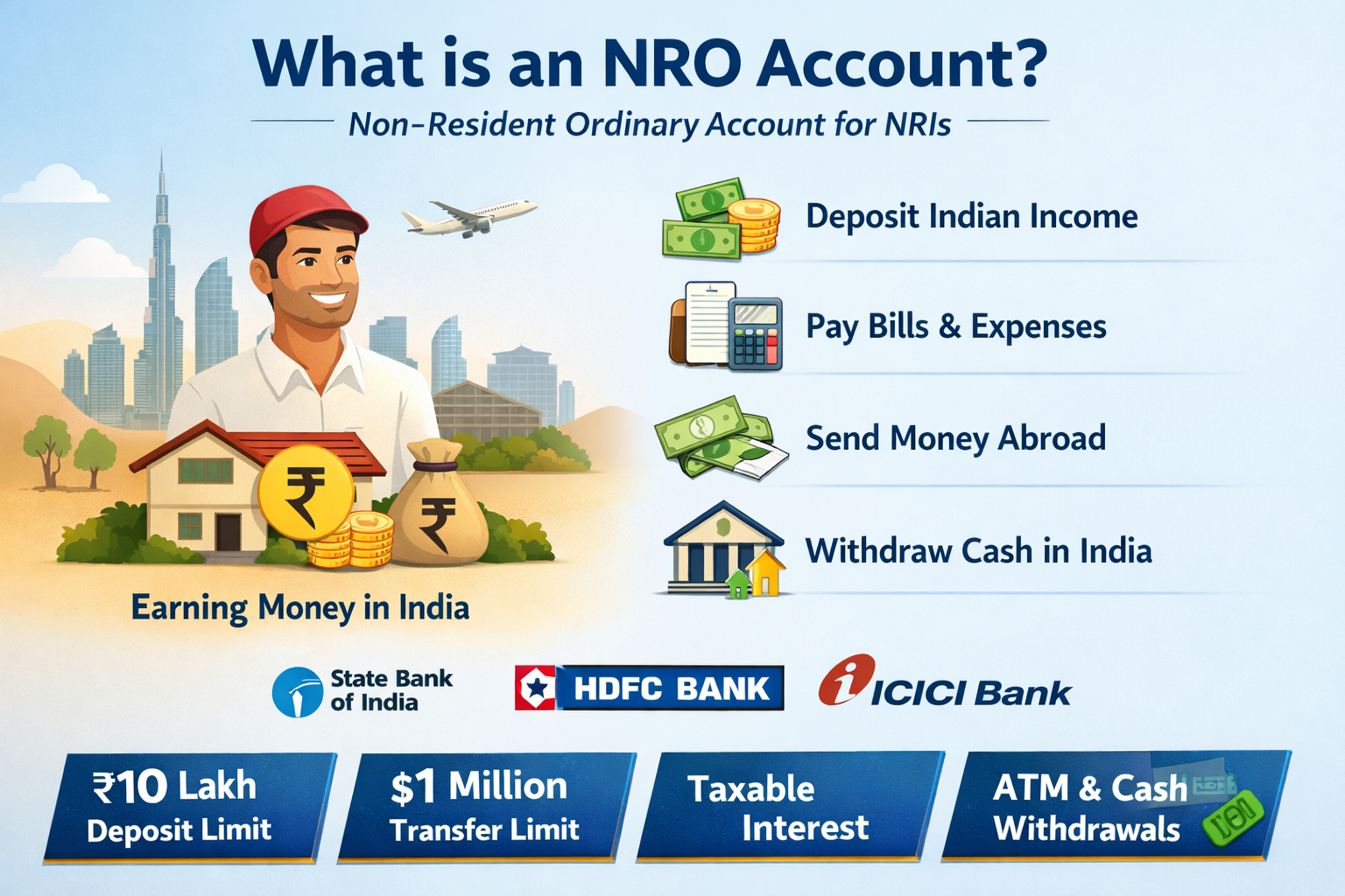 An NRO (Non-Resident Ordinary) account is a bank account in India for NRIs who live abroad but still earn income in India, such as rent, pension, or interest. It helps manage Indian expenses, withdraw cash during visits, and transfer money abroad legally while following tax rules. This account is useful for maintaining financial connections with India.