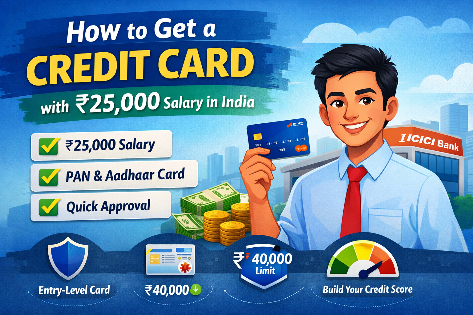 Learn how to get a credit card in India even with a ₹25,000 monthly salary. This beginner-friendly guide explains eligibility, where to apply, required documents, and a real-life example of a private bank employee getting approved easily.